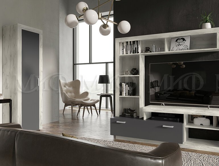 Материал: ЛДСП Цвет: Белый глянец/Дуб сонома, Графит/Дуб крафт белый, Графит/Дуб Юкон. Комплектация гостиной на фото: Центральная секция Ангара (1705 х 1705 х 416 мм) Пенал Ангара (584 х 2070 х 396 мм) Шкаф 2-х ств. Ангара (900 х 2070 х 396 мм)
